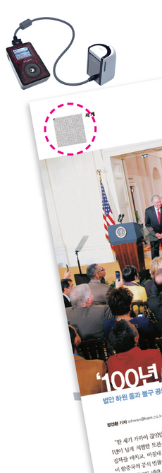 <한겨레21>이 이번호부터 시각장애인을 위한 ‘2차원 고밀도 바코드’를 도입합니다. 본문 페이지 왼쪽 상단에 새겨진 바코드를 장애인 보조기기인 ‘인쇄물 음성변환 출력기’로 스캐닝하면 해당 두 페이지의 제목과 본문 내용을 음성으로 읽어줍니다.