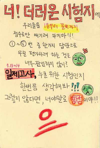 페이스북 0트위터 0공유네이버블로그카카오스토리카카오톡 공유하기스크랩프린트크게 작게[비밀엽서] 더러운 시험지 한국판 ‘비밀엽서 프로젝트’에 초대합니다 ◎ 엽서 보낼 주소 서울시 마포구 공덕동 116-25 한겨레신문사 4층 <한겨레21> ‘비밀엽서’ 담당자 앞 (우)121-750 한겨레와 함께 걸어주세요섬세하게 세상을 보고 용기있게 기사를 쓰겠습니다.후원하기후원제 소개좋은 언론을 향한 동행,한겨레를 후원해 주세요한겨레는 독자의 신뢰를 바탕으로 취재하고 보도합니다.후원하기후원제 소개당신의 가치를 후원으로 얹어주세요평화를 갈망하는 마음, 평등을 지향하는 마음,환경을 염려하는 마음...후원하기후원제 소개����한국판 ‘비밀엽서 프로젝트’[비밀엽서] 내 나이 19, 그의 나이 20[비밀엽서] 웃고 싶지 않아요[비밀엽서] 힘든걸요한겨레21 인기기사제 1601호20260216차례보기지난호보기낱권구입구독신청한겨레 인기기사