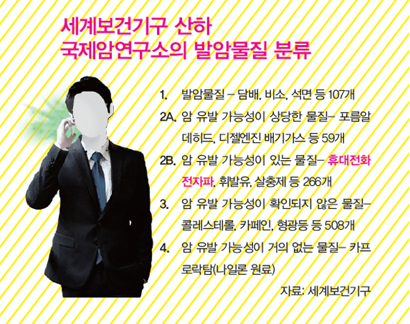 휴대전화 전자파가 뇌종양을 유발할 가능성이 있다고 세계보건기구(WHO)가 5월31일 공식 발표했다. WHO 산하 국제암연구소(IARC)는 이날 휴대전화 전자파를 ‘암 유발 가능성이 있음’을 뜻하는 ‘발암 위험 평가 기준 2B’로 분류했다. 이 기준은 전체 다섯 가지 기준 가운데 세 번째다. IARC는 14개국 출신의 전문가 31명이 모여 지금까지 발표된 수많은 연구 논문을 분석해 이런 결론을 내렸다고 밝혔다. IARC는 “10년 넘게 하루 30분 이상 휴대전화를 사용할 경우 뇌종양의 일종인 신경교종양 발생 확률이 40% 높아진다고 볼 수 있다”고 설명했다. 세상에서 가장 끔찍한 공장