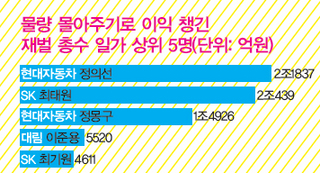 재벌 총수 일가들이 내부 거래로 막대한 부를 챙긴 것으로 나타났다. 경제개혁연구소는 6월29일 ‘회사기회 유용과 지원성 거래를 통한 지배주주 일가의 부의 증식에 관한 보고서’를 내 29개 재벌기업의 총수 일가 190명이 내부 거래로 9조9588억원의 이익을 챙겼다고 밝혔다. 가장 많은 이득을 챙긴 사람은 정의선 현대자동차 부회장으로 글로비스와 오토에버시스템즈 등에 446억원을 투자해 2조1837억원을 벌었다.