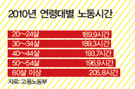 이중고다. 청년층은 일이 없어서 괴롭고, 노인층은 일이 고돼서 괴롭다. 고용노동부가 내놓은 ‘고용형태별 근로실태 조사’를 보면, 60대 이상 노동자의 노동시간이 월 205.8시간으로 가장 길었다. 반면 25~34살의 월평균 노동시간은 189.3시간으로 상대적으로 짧았다. 전반적으로 젊은 세대로 갈수록 노동자의 노동시간을 짧아졌다. 60살 이상이 24시간 맞교대를 하는 경비직이나 시설관리직을 많이 맡는 반면, 20대 젊은 세대는 아르바이트 등 파트타임 노동을 하는 탓이 큰 것으로 풀이된다.