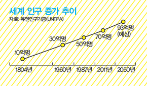 그 옛날 포스터를 기억하는 이가 있을지도 모르겠다. 인구가 폭발하는 지구에서 공간이 좁아 사람들이 우주로 밀려 떨어지는 그림은 종말론에 대한 은근한 공포까지 자극했다. 우리나라에서도 둘만 낳아 잘 기르자고 호소하던 시절이었다. 30년 정도 지나자 이제는 거꾸로 정부가 나서서 출산 장려를 하고 있다. 격세지감이다. 한국의 시계는 지구와 반대로 도나 보다. 지구의 인구는 지금도 불어나고 있다. 10월31일에는 세계 인구가 70억 명을 돌파할 것으로 유엔인구기금은 내다봤다.