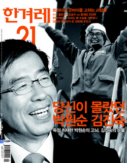 무소속 박원순 후보가 서울시장이 되자, <한겨레21>은 박원순 시장의 행보를 다루었다. 서울시립대 반값 등록금부터 시작해 그의 공약은 점차 실현되는 듯하다. 하지만 부담스러울 정도로 예찬 일색이다. ‘거대 언론의 비우호적 질문’이라는 부분에서 납득할 만한 답변을 싣지 않은 것은 아쉽다. 박 시장이 직접 발표했다는 예산안에 대한 구체적인 내용도 있었으면 했다. 이전 시장과 다른 박원순 시장의 인간적인 면을 강조하는 것도 좋지만, 시장으로서의 능력과 구체적인 공약 실현 과정에 대해 다시 한번 기사로 다뤄주기를 바란다. 류하경 “잊고 있던 그들의 고통 일깨워”
