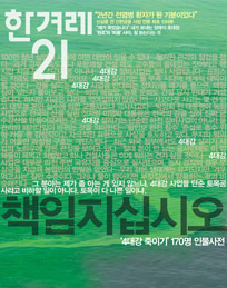 백대현 기억의 의무 4대강 레알사전. 내용은 계속 반복되고 재미는 없었으나 한명 한명 빠짐없이 읽었다. 기억해야 한다는 의무감. 자신이 했던 일에 대해 기득권일수록 책임지지 않는다. 고위 관료, 정치인 모두 한 번 하고는 조용히 뒤로 빠져버린다. 아니, 기업의 간부도 마찬가지일 것이다. 책임지는 건 늘 권한이 없는 아랫사람들, 아니면 세금 내는 보통 사람들. 후일 4대강 사전에 이름이 있는 자들은 변명거리를 생각해둬야 할 것이다. 어디서든 추궁당할 수 있을 것이다. 자신이 한 일, 한 말에 대해 책임을 다해야 할 것이다. 전상규 증오의 종말 지난 대선을 통해 우리 정치의 현주소를 찬찬히 살펴보는 ‘레트로 2012 대선’은 의미 있는 기획이다. 특히 이번호에서 다룬 증오정치의 청산이야말로 우리 사회가 진지하게 고민해야 할 문제다. 서로 협력해 공익을 추구해야 할 민주주의가 언제부터 이처럼 승자와 패자가 뚜렷이 구분되는 한판 승부가 돼버렸는가. 상생의 정치라는 민주주의 본연의 원리를 실현하려면 무엇보다 승자독식의 정치 구조 개혁이 필요하다. 이를 지속적으로 공론화해주기 바란다. 황소연 고운 말의 시작