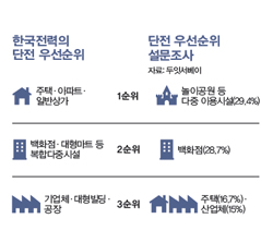 만만한 곳은 가정집이었다. 6월 초 국회에 출석한 조환익 한국전력 사장은 예비전력이 100만kW 이하 로 떨어지면, 주택·아파트·일반상가→백화점·대형마트→기업체·대형빌딩·공장 순서로 전기를 끊는 다고 밝혔다. 한전이 내부적으로 마련한 비상전력운영계획 지침이다. 그러나 ‘민심’에서 드러나는 비상 전력운영계획은 좀 다르다. 온라인 설문조사기업 두잇서베이가 지난 6월25일 온라인 이용자 7271명을 대상으로 전력 수급 위기가 발생했을 때 단전 우선순위를 묻는 설문조사를 한 결과, ‘놀이공원 등 다중 이용시설’(29.4%)을 1순위로 꼽았다. ‘백화점’(28.7%), ‘주택’(16.7%), ‘산업체’(15%)가 뒤를 이었다. 정부와 국민 사이에 단전의 심리적 간극이 벌어질 만하다.