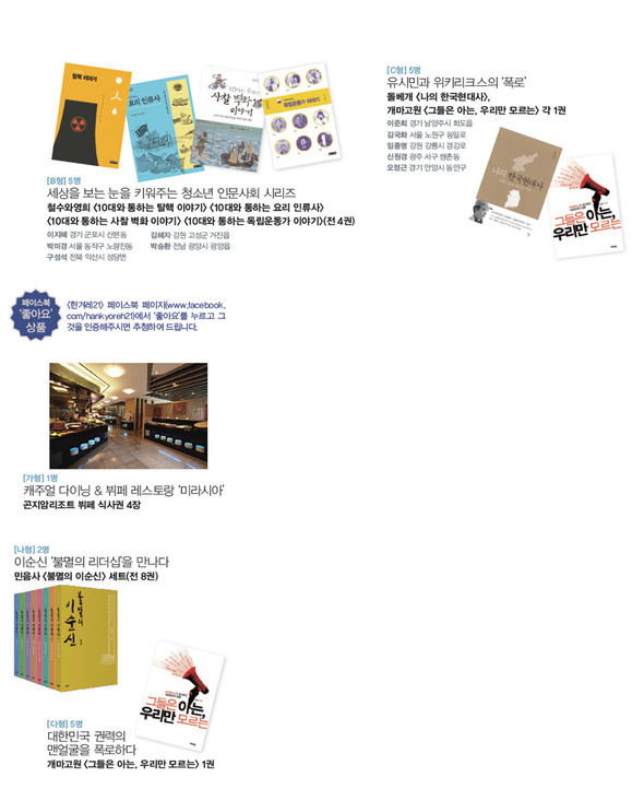 아, 그런데 이번 한가위 퀴즈큰잔치 상품이 아직 남았습니다. 바로 ‘페이스북 좋아요 누르기’ 상품입니다. ‘<한겨레21> 페이스북 좋아요 누르기 운동’에 동참해주신 독자는 애초 예상보다 많지 않더군요. 아마 참가 방법이 다소 어려운 탓도 있겠지요. 그래서 다시 한번 말씀드립니다. 페이스북 친구들에게 <한겨레21> 페이지 ‘좋아요’ 누르기를 추천해주세요. 추천을 해주시면 페이스북에서 친구 중 몇 분이 ‘좋아요’를 눌렀는지 알림이 뜹니다. 알림 화면을 캡처해서 출제위원장의 전자우편으로 10월7일(화요일) 밤 12시까지 보내주시면 추첨을 통해 상품을 드립니다. 상품은 57쪽을 참고해주세요. 전자우편 제목은 ‘<한겨레21> 페북 추천 응모[(본인 이름) ○○명 추천]’으로 적어주시면 됩니다. 전자우편 내용에 이름, 주소, 전화번호를 적어주시는 것 잊지 마세요! 참, 상품 배송에는 2-3주 가량 소요됩니다. 즐겁게 기다려주세요.