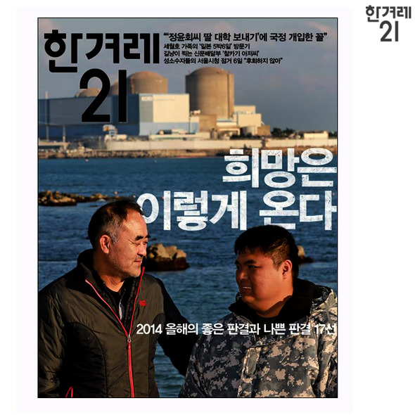 정윤회 게이트와 땅콩 회항 대신 다른 표지를 선택한 <한겨레21>에는 표지이야기로 올 한 해를 관통한 ‘올해의 좋은 판결과 나쁜 판결 17선’을 담았습니다. 법조계 전문가로 구성한 심사위원단은 ‘최고의 판결’로 ‘원자력발전소 인근 주민의 갑상선암에 대해 원전 쪽 책임을 처음 인정한 판결’을 뽑았습니다. 이 판결로 원전 주변 주민들은 12월16일 집단 소송을 시작했습니다. 세월호 유가족들이 일본에 가 후쿠시마 원전 국회 조사위원회 관계자와 참사 JR후쿠치야마선 탈선 사고, JAL기 추락 사고 유가족과의 만남을 기록한 기사도 눈에 띕니다. 내년 1월 첫 발을 내딛는 세월호 특별조사위에게 시사하는 바가 큽니다. 길고양이를 찍은 사진을 모아 책을 낸 사진가 겸 신문배달부인 김하연씨 인터뷰도 놓치지 마세요.