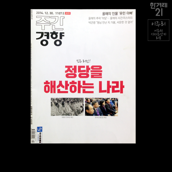<시사인>과 마찬가지로 통합진보당 해산 결정을 전면에 내세웠습니다. 다만, 표지에 1958년 진보당 해산과 2014년 통합진보당 해산 사진을 맞세웠다는 점이 눈에 띕니다. <주간경향>은 8대 1 판결을 내놓은 헌법재판소가 다양성의 균형추가 무너졌다는 점에 주목했습니다. 박근령 육영재단 전 이사장의 인터뷰도 실렸습니다. 올해의 인물로는 유민 아빠, 새정치민주연합, 정윤회, 미생, 유병언 사망, 이건희 병세, 프란치스코 교황, 영화 <명량>을 선정했습니다.