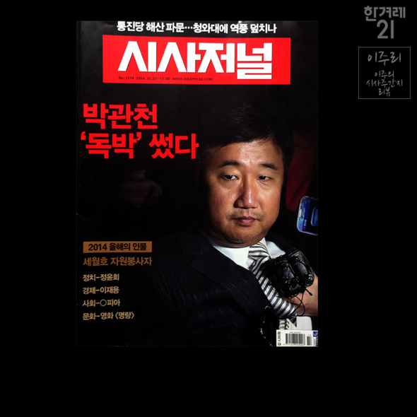 무표정한 박관천 경정의 사진이 표지입니다. ‘정윤회 게이트’의 수사와 관련해 <시사저널>은 박 경정으로부터 제보를 받고 기사를 쓰지 않았다는 새로운 내용을 내놨습니다. 사건을 새로운 국면으로 갈 수 있는 열쇠가 될지도 모릅니다. <시사저널>도 올해의 인물을 정리했습니다. 세월호 자원봉사자, 정윤회, 이재용, ○피아, 영화 <명량>, 프란치스코 교황, 유룡, 신해철, 넥센히어로즈, 유병언이 있습니다.