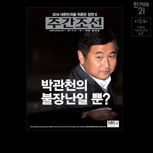 이번 주 시사주간지는 송년호가 대부분입니다. 2014년의 마지막 잡지인 셈이죠. 송년호의 ‘관전 포인트’는 각각의 시사주간지가 올 한 해를 어떻게 정리했는지를 비교하는 겁니다. 지난주 ‘올해의 판결’을 뽑아 한 해를 정리한 <한겨레21>과 달리 다른 주간지에서는 송년호에 ‘올해의 인물’을 다뤘습니다. 표지에서는 ‘정윤회 게이트’에서 문건 유출 혐의를 받은 박관천 경정과 통합진보당 해산 결정이 경합을 벌이고 있군요. <한겨레21>의 표지와 다른 시사주간지의 표지가 어떻게 다른지 한 번 비교해보세요. 자, 출발합니다!