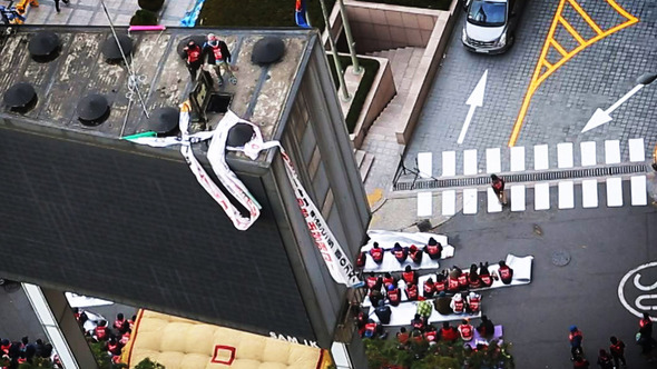서울 광화문광장 옆 광고탑에 오른 씨앤앰 비정규직 해고노동자들의 모습. 한겨레 이정용.