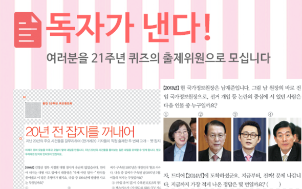 <한겨레21>도 창조적으로 21주년 창간기념 큰 잔치를 해보겠습니다. 이름 하여 '독자가 낸다' 퀴이~즈.