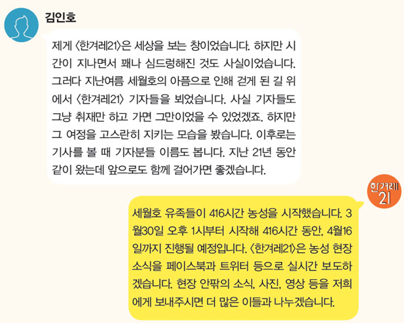 세월호 유족들이 416시간 농성을 시작했습니다. 3월30일 오후 1시부터 시작해 416시간 동안, 4월16일까지 진행될 예정입니다. <한겨레21>은 농성 현장 소식을 페이스북과 트위터 등으로 실시간 보도하겠습니다. 현장 안팎의 소식, 사진, 영상 등을 저희에게 보내주시면 더 많은 이들과 나누겠습니다.