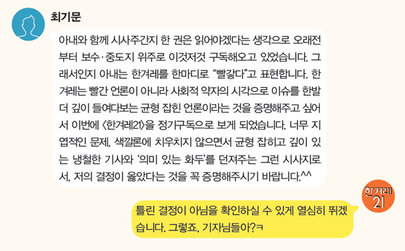 아내와 함께 시사주간지 한 권은 읽어야겠다는 생각으로 오래전부터 보수·중도지 위주로 이것저것 구독해오고 있었습니다. 그래서인지 아내는 한겨레를 한마디로 “빨갛다”고 표현합니다. 한겨레는 빨간 언론이 아니라 사회적 약자의 시각으로 이슈를 한발 더 깊이 들여다보는 균형 잡힌 언론이라는 것을 증명해주고 싶어서 이번에 <한겨레21>을 정기구독으로 보게 되었습니다. 너무 지엽적인 문제, 색깔론에 치우치지 않으면서 균형 잡히고 깊이 있는 냉철한 기사와 ‘의미 있는 화두’를 던져주는 그런 시사지로서, 저의 결정이 옳았다는 것을 꼭 증명해주시기 바랍니다.^^