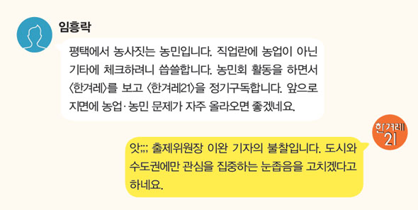평택에서 농사짓는 농민입니다. 직업란에 농업이 아닌 기타에 체크하려니 씁쓸합니다. 농민회 활동을 하면서 <한겨레>를 보고 <한겨레21>을 정기구독합니다. 앞으로 지면에 농업·농민 문제가 자주 올라오면 좋겠네요.