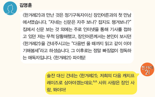 제게 <한겨레21>은 세상을 보는 창이었습니다. 하지만 시간이 지나면서 꽤나 심드렁해진 것도 사실이었습니다. 그러다 지난여름 세월호의 아픔으로 인해 걷게 된 길 위에서 <한겨레21> 기자들을 뵈었습니다. 사실 기자들도 그냥 취재만 하고 가면 그만이었을 수 있었겠죠. 하지만 그 여정을 고스란히 지키는 모습을 봤습니다. 이후로는 기사를 볼 때 기자분들 이름도 봅니다. 지난 21년 동안 같이 왔는데 앞으로도 함께 걸어가면 좋겠습니다.