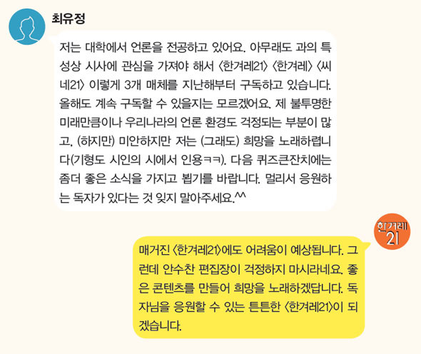 저는 대학에서 언론을 전공하고 있어요. 아무래도 과의 특성상 시사에 관심을 가져야 해서 <한겨레21> <한겨레> <씨네21> 이렇게 3개 매체를 지난해부터 구독하고 있습니다. 올해도 계속 구독할 수 있을지는 모르겠어요. 제 불투명한 미래만큼이나 우리나라의 언론 환경도 걱정되는 부분이 많고, (하지만) 미안하지만 저는 (그래도) 희망을 노래하렵니다(기형도 시인의 시에서 인용ㅋㅋ). 다음 퀴즈큰잔치에는 좀더 좋은 소식을 가지고 뵙기를 바랍니다. 멀리서 응원하는 독자가 있다는 것 잊지 말아주세요.^^