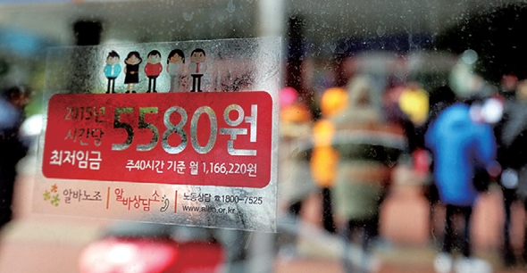 고용노동부가 4월28일 발표한 ‘고용형태별 근로실태 조사’ 결과, 정규직 노동자의 시간당 임금총액은 1만8426원으로 한 해 전보다 5.1% 상승한 반면, 비정규직 노동자의 시간당 임금총액은 1만1463원으로 1.8% 오르는 데 그쳤다. 비정규직 가운데 하루 8시간 미만 일하는 단시간노동자(아르바이트)의 임금증가율이 최저임금 인상의 영향으로 7.4% 올랐을 뿐, 통상 ‘계약직’으로 부르는 기간제노동자(-1.2%), 파견노동자(-3.9%), 용역노동자(-0.1%), 일일노동자(-1.4%) 모두 전년보다 오히려 줄었다. 이들 비정규직 임금이 감소세를 보인 건 2009년 이후 5년 만이다. 아르바이트 노동자가 전체 비정규직에서 차지하는 비중이 32%가량이니, 전체 비정규직 노동자 10명 중 7명은 임금이 줄어든 셈.[%%IMAGE7%%]