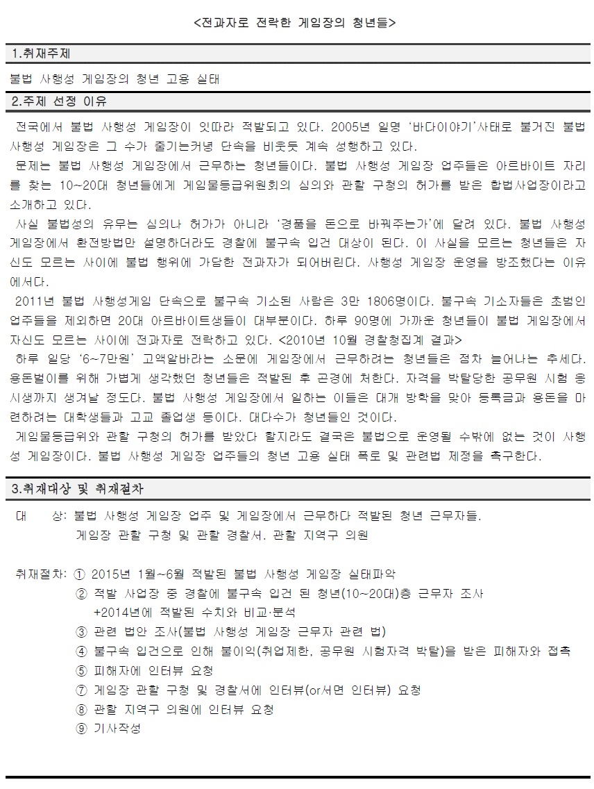 2. 취재계획서는 자유주제로 쓰시면 됩니다. (200자 원고지 10매 내외)