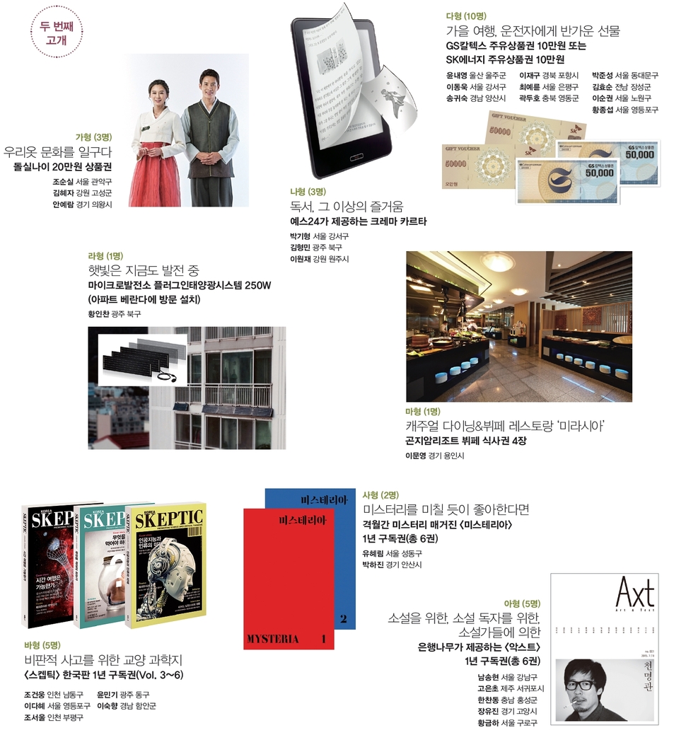 우편 도착 시각을 믿을 수 없다며 직접 사무실에 들르신 독자님들부터 지역 멀리서 손수 우편을 부쳐주신 독자님들까지, 한가위 퀴즈큰잔치에 참여해주신 모든 분들께 감사드립니다. 행운이 일상이 되고 불운이 추억이 될 때쯤, 내년에도 잔치는 계속됩니다.