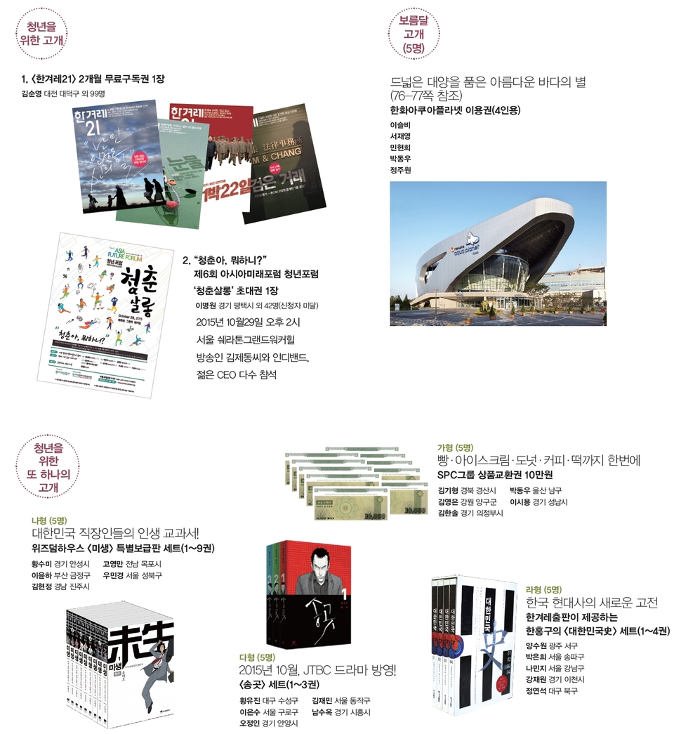 한가위 합본호(제1080호)에선 잔치 개혁을 완료했다고 큰소릴 쳤지만, 개혁 뒤엔 고난이 따른다는 점 그땐 알지 못했습니다. 응모하신 독자분들께 최대한 여러 번 당첨 기회가 주어질 수 있도록 하자는 명분조차 없었다면 개혁은 수포로 돌아갈 수도 있었겠습니다.