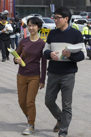 지난 4월18일 서울시청 앞 광장에서 세월호 참사 1주기 <한겨레21> 특별판을 배포하는 정은주(왼쪽)·이문영 기자. 박승화 기자