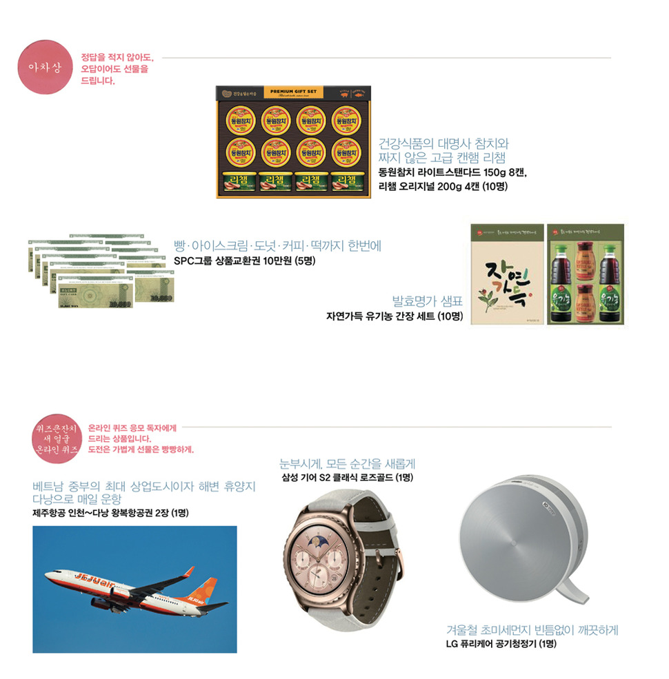 쉬운 문제와 더불어 응모 방식도 대폭 간소화했습니다. 그동안 고개별로, 원하는 상품을 골라 응모하던 방식을 폐지했습니다. 세 고개의 문제를 모두 맞혀야 최신형 자동차부터 제주 왕복 항공권 등 상품에 응모됩니다. 하지만 정답 칸을 하나도 채우지 않아도, 답을 밀려 써도, 오답을 써도 괜찮습니다. 성함, 주소, 연락처만 쓴 오답 엽서도 소중히 받겠습니다. 우리에겐 패자부활전, 아차상이 있으니까요.