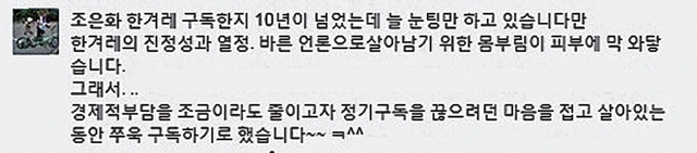 <한겨레21> 페이스북 정기독자 커뮤니티 ‘21cm’로 두 분의 독자님이 응원해주셨습니다.