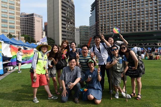 소라미 변호사(맨 앞줄 오른쪽)가 지난해 퀴어문화 축제 때 ‘공감’ 변호사들, 자원활동가들과 함께 서울시청 앞에서 찍은 사진. ‘공감’은 성소수자, 이주여성, 아동 등의 인권 문제를 주로 다루는 공익인권법단체다. 소라미 제공