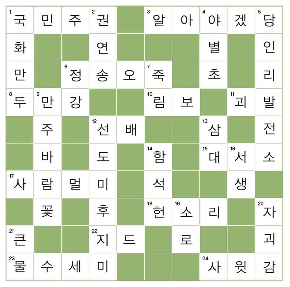 오답은 다양했습니다. 세로 7번(‘죽림’)을 맞힌 분들의 고뇌가 특히 더 역력했습니다. ‘림프’가 압도적으로 많긴 했지만, ‘림’으로 시작하는 각종 낱말들의 향연이 이어졌습니다. 장기화된 경기 침체가 청년 세대들의 꿈과 의욕을 앗아가 세상을 연옥으로 만들고 있는 때, <한겨레21>마저 누군가들의 당첨 기회를 박탈한 것은 아닌지 그 낱말들의 모음을 유심히 살피는 마음은 괴로웠습니다.