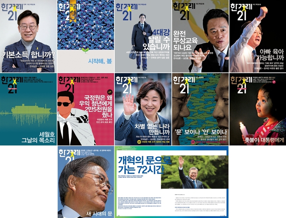 <한겨레21>은 제1152호부터 대선 특집을 시작했다. 제1161호까지 표지 사진(위). 문재인 대통령의 당선을 표지이야기로 다룬 제1162호의 표지 사진과 표지이야기 기사.