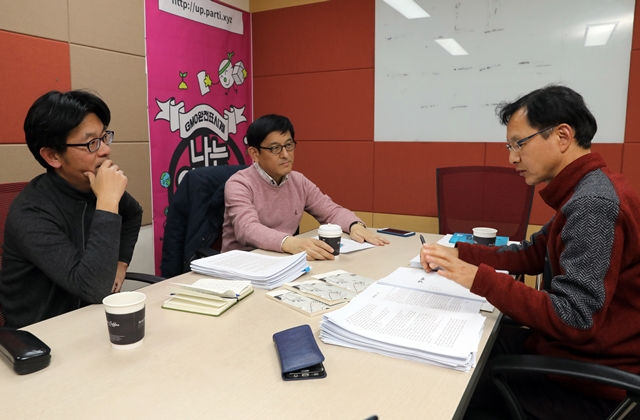 12월1일 서울 마포구 공덕동에 있는 <한겨레21> 회의실에서 (왼쪽부터) 이명원 문학평론가, 권성우 문학평론가, 최재봉 기자가 손바닥문학상 본심 심사를 하고 있다. 정용일 기자