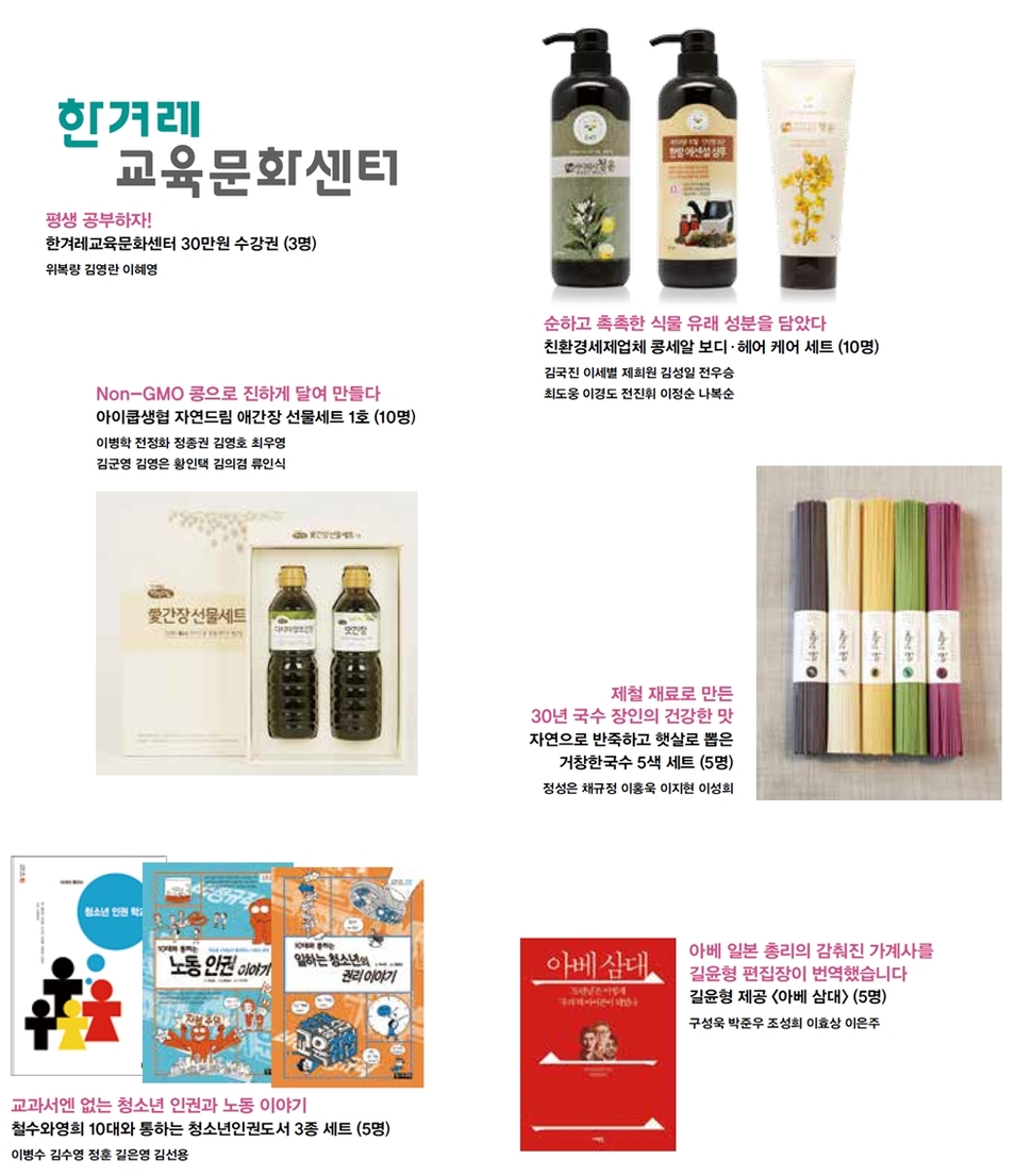 되로 주고 말로 받았습니다. 독자 여러분께 미약하나마 감사의 마음을 전하기 위해 퀴즈큰잔치를 열었는데, 오히려 독자 여러분께 격려와 용기를 듬뿍 받았습니다. 충실한 기사로 못 채워드린 독자 여러분의 허기를 상품으로나마 때우려 했던 얄팍한 수가 훤히 드러난 것 같아 얼굴이 후끈거립니다. 독자 여러분께서 응모엽서에 깨알 같은 손글씨로 적어 보내주신 격려와 질책, 응원의 목소리 깊이 새겨듣겠습니다. 지난 한 해 이런저런 악재 속에서도 <한겨레21>이 머리끈을 질끈 동여매고, 그래도 다시 앞으로 나아갈 수 있었던 건 독자 여러분의 성원 덕분입니다. 거듭 감사 말씀을 전합니다.