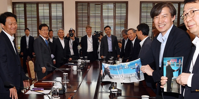 대통령 주재 청와대 수석비서관 회의에서 조국 수석이 <한겨레21>을 펼쳐들고 있는 사진을 본 느낌은?