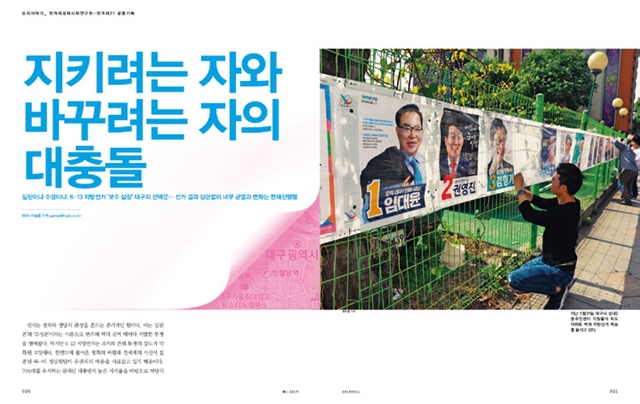 자유한국당은 부동층이 ‘샤이 보수’라고, 70%는 자신들에게 표가 올 거라고 예측한다. 속내를 드러내지 않는 ‘샤이 보수’가 많은 대구에선 취재도 어려웠겠다. 일단 취재 초기 대구시장을 지냈거나 고위직에 있었던 분들에게 많이 까였다. ‘한겨레’라는 말을 꺼내는 순간 정중하게 거절하는 분들도 있었다. 나는 <한겨레21> 기자인데 왜 21을 21이라고 부를 여유가 없단 말인가. 취재하면서 대구가 고향인 어머니와 지금은 대구를 떠난 외가를 엄청 팔아먹었다. 자유한국당을 출입하는 기자들 중 TK(대구·경북) 출신들은 전략적으로 사투리를 쓰기도 한다. 그 생각은 났는데…. 경기도에서 태어난 내가 아무리 연습을 해도…. 대구의 ‘레알 보수’도 <한겨레21> 취재에 흔쾌히 응하는 그날까지 고고~. 다른 어려움은. 4년 전 지방선거 때도 대구에서 2박3일 취재한 적이 있는데, 기사를 올리면 데스크를 보는 사람들은 꼭 묻는다 “사투리가 없네?” 이번에도 편집장의 질문을 듣고 ‘생각보다 사투리 많이 안 쓴다고요’라고 외치고 싶었지만 직업인의 도리로서 꾹 참고 사투리를 많이 쓰시는 시민들을 찾아헤맸다. 억양은 분명 다르긴 하다. 내가 못 알아듣는 것일까? 결국 영상이 대세인가? 이런 자책을 끊임없이 했다. 취재 중 만난 이들 가운데 인상적인 사람은. 박근혜 정부에서 대구 문화계 블랙리스트 6명 가운데 한 명을 만났다. 이번에 구의원 비례로 출마했는데 그분 이야기를 들어보니… “그냥 누가 전화해서 ‘문재인 지지하냐’고 해서 ‘네’라고 대답했다. 그런데 블랙리스트에 올랐더라.” 참, 그놈의 블랙리스트는 ‘웃프다’. 최근 여론조사에서 대구가 자유한국당과 민주당의 격전지가 되고 있다. 그러게, 취재를 할 때만 해도 이렇게 판도가 바뀔 거라고 예상을…. 아니다, 다 과학적 분석과 전망으로 예측했다. 선견지명이었다. (웃음)