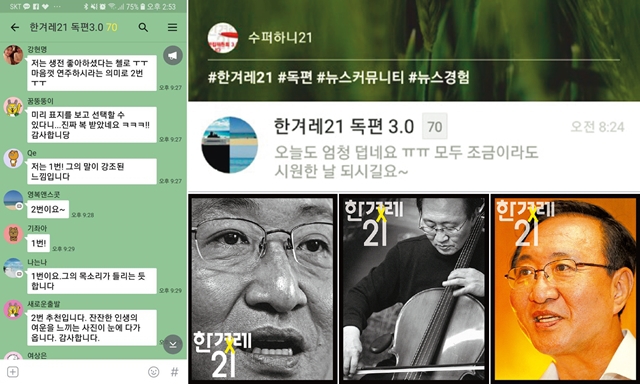 제1223호 마감일인 7월27일 밤 독편 카톡방에서 표지 후보 셋(오른쪽 아래)을 두고 독편들이 ‘투표’를 하고 있다(왼쪽 갈무리). 매주 금요일 밤 독편 카톡방에선 표지 후보 투표가 이뤄질 예정이다. 독편 카톡방 화면 갈무리/ 디자인주 제공