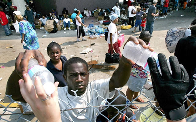 철책 안 생수 두 병을 건네받는 검은 얼굴, 그 뒤 짐 보따리를 들고 걸어가는 머리에 수건 쓴 여인, 멀리 떼 지어 앉거나 하릴없이 서 있는 사람, 아무 데나 널브러진 짐과 쓰레기. 어느 아프리카 난민촌을 떠올리게 한다. 사진의 실제 배경은 2005년 9월 미국 뉴올리언스 공항 임시 병원. 허리케인 카트리나가 남긴 재난 현장이다.