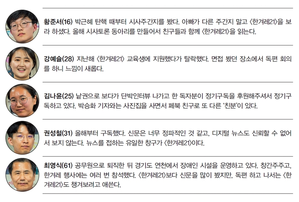 황 오프라인 모임은 필요하다. 학교에서 <한겨레21>로 시사토론 동아리를 하고 있다. 동아리를 운영해보니 10대들이 시사에 관심이 없었다. 무작정 ‘내가 맛있는 거 사줄게’ 하고 모임을 꾸렸다. 동아리 활동 이후 친구들이 교실에서 드루킹, 남북 정상회담이 어땠다는 얘기를 하기 시작했다.