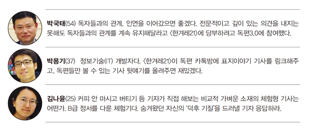 박용기 ‘40대’ ‘심리’ 등을 다루는 말랑말랑한 내용의 연재가 늘었다. 읽다보면 나 자신을 더 사랑해야 할 것 같다. 쓴소리 하자면 그런 글을 쓰던 사람이 외고를 맡게 돼 계속 그런 글을 쓰는 것도 같다. ‘대한민국 1호 프로파일러’도 재밌게 읽고 있다. 전문가가 자신의 분야에 대해 쓴 글은 내용이 어렵더라도 의미는 있다고 본다. ‘박점규의 갑돌이와 갑순이’도 잘 읽고 있다. 김나윤 9월11일 열린 독편3.0 첫 번째 오프라인 모임에서 지적한 내용이 반영됐다. 고정 꼭지를 맡은 외부 필진을 자세히 소개하는 글이 생겼다. 작가의 히스토리를 알게 됐다. 왜 작가가 이런 내용의 외고를 썼는지 이해하게 됐다. 외고를 보면서 필진에 대해서도 궁금해졌다. 필자를 소개해주는 글이 생겨 조금이라도 그들을 알게 됐다. 기존 외고 필자도 소급해 소개하면 안 되나. ‘대한민국 1호 프로파일러’를 제일 열심히 본다. 참치 외고 필자가 어떤 사람인지 검색해본다. 어디서, 어떤 일을 하는 사람인지 안 뒤 글을 보는 게 편하다. 어떤 의도를 갖고 자신이 속한 기관이나 단체의 입장을 담았는지 알 수 있어서다. ‘최지은의 직시’를 좋아한다. 김나윤 레드(RED) 기사에 성 감수성이 높은 콘텐츠가 많아졌다. ‘블루’(레드 외)랑 레드가 이분법처럼 나뉘는 느낌이 든다. 레드에 들어갈 수 있는 내용이 블루에도 들어갈 수 있는데도, 블루는 시사라면 레드는 너무 말랑말랑해졌다. 지면 개편 뒤 레드 색이 짙어졌다. 참치 나는 좋다. 흐름대로 읽으면 레드에서 끊어지는 느낌이 있다. 그러나 시사적인 내용을 읽고 싶으면 블루를, 가벼운 내용을 읽고 싶다면 레드를 본다. 단편적으로 읽기 좋다. 박국태 제1233호 ‘소심한 악녀의 수상한 상담소’ 첫 회 초반부를 재밌게 읽었다. 도시락에, 설거지 얘기는 내 얘기였다. 김밥을 사왔더니 상사가 부하 직원들에게 식사 준비를 시켰다. 차라리 밖에서 김밥을 사 먹는 게 나았다. 충분히 공감됐다. 하지만 후반부로 갈수록 내용이 어려워졌다. 개인적으로는 쉽게 결론을 내려준다면 더 좋겠다. ‘한겨레’와 협업하면 기사 파급력 높아지나 <한겨레21>이 <한겨레> 지면, 누리집 등 다양한 플랫폼을 활용해 기사를 쓰고 있다. 어떻게 보나. 김나윤 <한겨레>를 같이 보고 있다. 가짜뉴스는 <한겨레>에서도 비중 있게 다뤄졌다. <한겨레>에도 비중 있게 실리면 날마다 오는 신문을 먼저 보게 된다. <한겨레>와 <한겨레21>에 실린 기사 내용도 달랐다. 구분이 뭔가. <한겨레>가 <한겨레21> 예고편처럼 나오면 <한겨레21>을 본지라고 볼 텐데 어떻게 구분이 되는지 모르겠다. 참치 <한겨레21>만 보는 독자들에게는 의미가 있다. <한겨레>와 협업해 기사 파급력을 높이려는 취지라면 공감한다. 박국태 <한겨레>와 협업하는 이유가 뭔가. 인력이 부족해서인가. 내용을 심도 있게 다루려고 협업하나. 특정 이슈 때문에 일시적으로 협업하는 건가. 인상 깊은 다른 표지이야기는 무엇이 있었나. 박국태 제1230호 ‘슬픈 돼지의 경고’ 기사가 인상 깊었다. 생각도 못한 문제다. 당연하게 돼지고기를 먹었던 것을 돌아보는 계기가 되었다. (물론 앞으로도 고기는 먹을 것 같다.) 폐수 문제도 생각보다 심각했다. ‘돼지’ 후속으로 소도 보도해달라 김나윤 제1233호 ‘특허는 너의 것’과 제1230호 ‘슬픈 돼지의 경고’ 등이 좋았다. 그동안 개·닭 얘기는 많이 나왔다. 생각해보면 소와 돼지는 암묵적으로 합의된 육식 고기였다. 돼지도 다시 한번 생각해보자는 의도가 좋았다. 후속으로 소도 부탁한다. 박용기 제1232호 ‘누가 어디에 혼자 사는가’에서 다양한 관점으로 1인가구를 다룰 것이라고 기대했다. 예를 들어 물리학자, 건축가, 통계학자, 미래학자 등 각 분야의 전문가들이 다양한 관점에서 어떻게 1인가구를 볼지 궁금했다. 기사들을 통해 왜 이 동네에 이 연령대 1인가구가 많이 사는지를 알게 됐다. 세계적인 현상을 여러 전문가가 분석해주는 후속 기사가 나왔으면 한다. 박국태 ‘누가 어디에 혼자 사는가’에선 50대 1인가구의 현실적인 모습이 구체적으로 잘 드러났다. 피부로 와닿았다. 쉽게 수긍됐다. 1인가구 증가로 당장 10년, 20년 뒤 한국 사회에 근본적인 혁명이 닥칠 텐데 후속 기사로 다뤄주면 좋겠다. 향후 10~20년 뒤 1인가구 증가에 대비할 수 있는 정책을 제시해달라. 박용기 정보기술(IT)에 관심이 많다. 배양 고기가 나오기 시작했다. 앞으로 배양 고기가 어떻게 될지 궁금하다. ‘특허는 너의 것’ 표지이야기 후속으로 유전자가위 기술을 국가 차원에서 제대로 활용했다면 사회에 어떤 결과를 일으킬 수 있었을지 다뤘으면 좋겠다. 외국 사례를 보여줘도 좋다. 기술 자체가 문제가 아니라 이를 잘못 쓴 게 문제니까 그런 예시를 다루면 독자가 더 쉽게 이해할 수 있을 것이다. 첫 독편3.0 오프라인 모임에서 지적한 부분을 지면에 반영하려 노력했다. 박용기 외고 필진 소개 말고는 바뀐 것을 잘 몰랐다. 어떤 경로로 피드백할 수 있나. 박국태 독자들은 세세하게 보지 않는다. 독자와 기자의 차이다. 독자에겐 바뀐 게 눈에 잘 들어오지 않고, 잘 모른다. 무엇을 어떻게 바꾸려는 접근보다는 오히려 내용