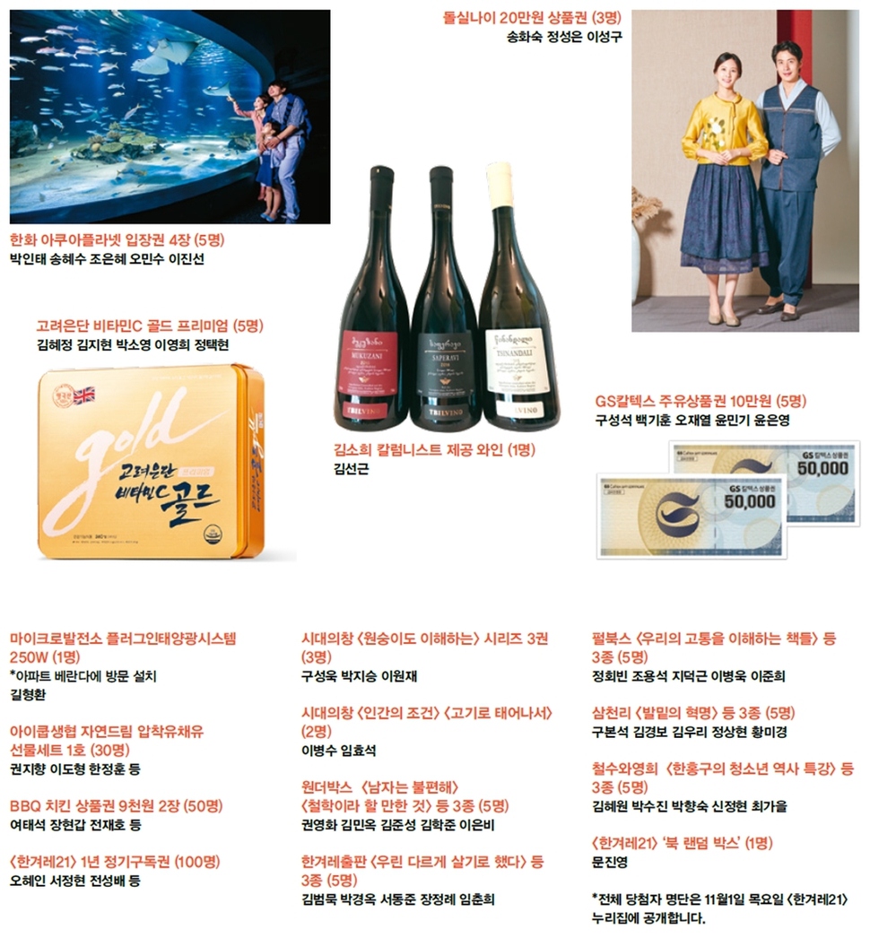 또 고개 숙여 사과드립니다. 퀴즈 문제가 너무 어렵다고 호소하거나 섭섭함을 표한 분들도 있었습니다. 문제 난이도에 대한 고민이 많았는데 독자분들의 마음을 모두 헤아리지 못한 것 같습니다. 다음 퀴즈큰잔치에는 좀더 쉬운 문제를 내려고 합니다. 한순간의 실수로 오답을 보낸 분들에게도 ‘아차상’으로 작은 상품을 드리려 합니다. 당첨자 수가 많다보니 전체 당첨자 명단은 11월1일 목요일 <한겨레21> 누리집에 공개하겠습니다.