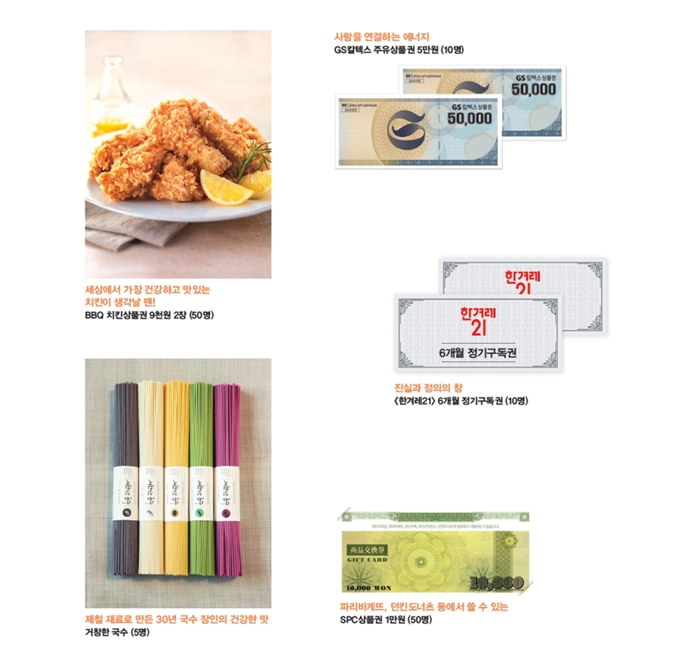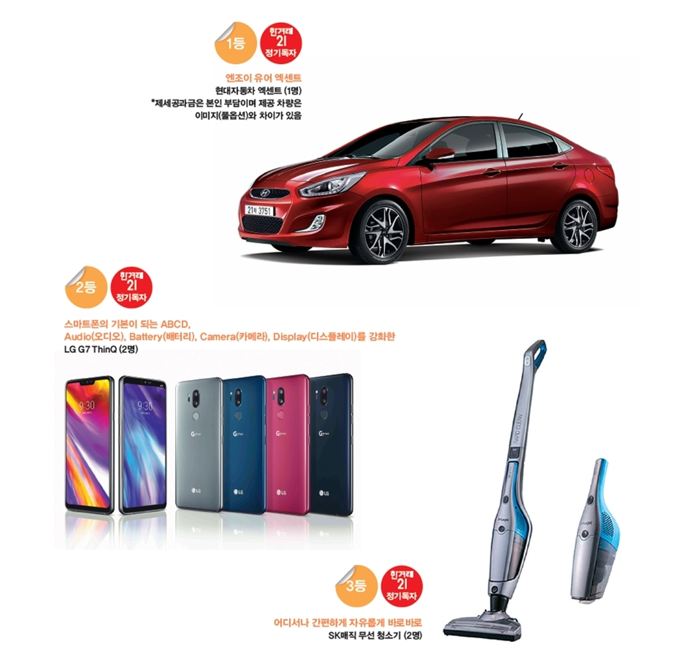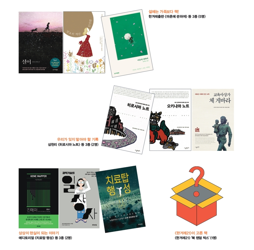 <한겨레21> 설 퀴즈큰잔치는 엽서로만 응모할 수 있습니다. 최근 몇 년간 스마트폰 앱으로도 응모를 받았지만, 정기독자와 가판 구독자에게 조금 더 기회를 주자는 취지에서 엽서로만 받습니다. 상품도 정기구독자에게 혜택을 더 드립니다. 1~3등 상품 당첨자는 오로지 정기구독자 중에서만 뽑습니다. 2월15일까지 <한겨레21> 정기구독(1년)을 신청하신 분들에게도 자격을 드립니다. 세 고개 문제를 모두 푼 뒤 설 합본호에 실린 답안지(응모엽서)에 정답을 적어 보내주세요. 세 고개 모두 정답을 맞힌 분이 우선 추첨 대상자가 됩니다. (정답을 맞히지 못한 분들도 추첨해 작은 상품을 드립니다.) 2월25일 소인이 찍힌 엽서까지 유효합니다. 엽서는 글씨가 번지지 않게 볼펜 또는 유성펜으로 쓰시길 권장합니다. 답안지는 살짝 풀칠만 해서 보내주세요. 종이 찍개 등으로 찍어 보내면 개봉 중 훼손될 수 있습니다. 당첨자는 <한겨레21> 제1253호와 누리집(h21.hani.co.kr)에 발표합니다. 문의 사항은 전자우편(gamja@hani.co.kr)으로 보내주세요.