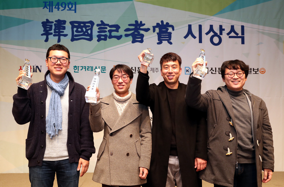 2018년 2월22일 제49회 한국기자상 시상식장. <한겨레21> ‘국가정보원 비선 민간여론조작 조직 알파팀’로 취재보도 부문에서 상을 받은 하어영·김완·정환봉 기자(오른쪽부터), ‘불타버린 코리안드림'으로 전문보도사진 부문에서 상을 받은 김성광 기자(맨 왼쪽). 한겨레 백소아 기자