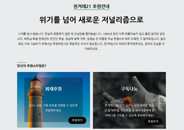 <한겨레21>이 기존 구독제를 넘어 후원제를 시작합니다. <한겨레21>은 1994년 창간 이래 25년 동안 성역 없는 이슈 파이팅, 독보적인 심층 보도로 퀄리티 저널리즘의 역사를 쌓아왔습니다. 현실이 아니라 진실에 영합하는 언론이 존속하기 위해서는 투명하면서 정의롭고 독립적인 수익이 필요합니다. 그게 바로 <한겨레21>의 가치를 아는 여러분의 조건 없는 직접 후원입니다. 정의와 진실을 지지하는 방법, <한겨레21>의 미래에 투자해주세요.