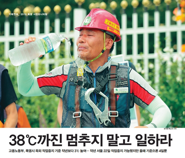 <한겨레21>은 7월5일 ‘38℃까진 멈추지 말고 일하라’(제1270호) 기사를 냈습니다. 고용노동부가 폭염시 옥외 작업중지 기준을 2018년보다 3℃ 높여 38℃로 설정했다는 내용이었습니다. 노동계 일각에선 “폭염 대책이 후퇴했다”는 지적이 나왔습니다.