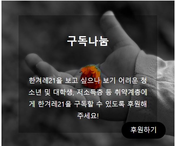 취재 후원과 더불어 <한겨레21>을 보고 싶지만 구독이 어려운 이들에게 구독을 후원하는 ‘구독 나눔’을 진행하고 있다.