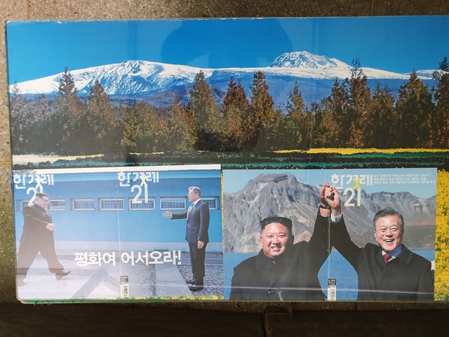 전남 여수의 한 인쇄소 사무실. 9월2일 낮 12시50분께 사무실에 들어가자마자 놓인 네모난 탁자 유리 밑에는 <한겨레21>(이하 <21>) 제1210호 표지 ‘평화여 어서 오라!’ 사진과 제1231호 표지가 깔려 있었습니다. 경기도 파주 판문점에서 문재인 대통령과 김정은 북한 국무위원장이 서로 마주 보며 군사분계선으로 성큼성큼 걸어오던 모습(제1210호)과, 두 정상이 백두산 장군봉에 올라 두 손을 맞잡은 채 두 팔을 번쩍 든 모습(제1231호)이었습니다. <21>이 평화의 염원을 담아 앞과 뒤로 나뉘었던 표지를 하나로 ‘통일’한 표지들이었습니다. 손님이 가장 많이 앉는 자리 바로 앞에 인쇄소에서 직접 찍은 인쇄물도 아닌 <21> 표지들을 깔아둔 주인공은 바로 <21> 구독 나눔 후원 독자 박길만(64)씨였습니다.