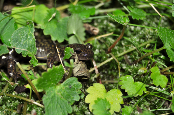한국 도롱뇽의 상징이라 할 수 있는 꼬리치레도롱뇽은 천성산을 통해 한 번 떴다가 요즈음은 잠시 주춤해졌다. 그렇지만 차가운 계곡물을 여유 있게 흔들듯 헤엄치는 자태만은 당당하다. 꼬리치레도롱뇽은 한반도 양서류 중에서 가장 맑은 물에 산다. 생활공간도 생태적으로 가장 울창한 숲에서만 산다. 이번 한·일 양서류 연대활동에서 꼬리치레도롱뇽을 찾은 건 국내 최대의 도로터널 공사 현장인 인제터널 때문이다.