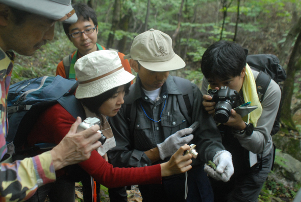 지난 8월26일 양서류 모니터링을 하려고 인제군 점봉산을 찾은 한-일 두 나라 환경운동가들이 희귀종인 무당개구리를 관찰하며 사진을 찍고 있다. 녹색연합 제공