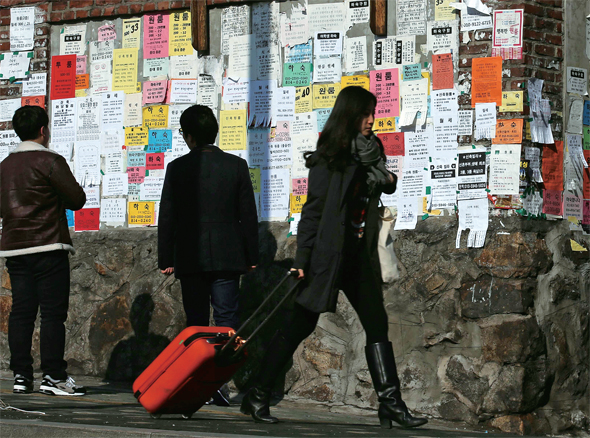 자취·하숙방 세입자를 구하는 전단이 지난 2월 서울 흑석동 중앙대 앞길 벽면에 빼곡하게 붙어 있다. 류우종 기자