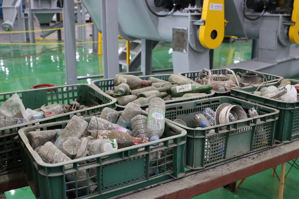 선별장 노동자들은 장갑을 끼고 음식물을 만지며 큰 덩어리를 건져낸다.